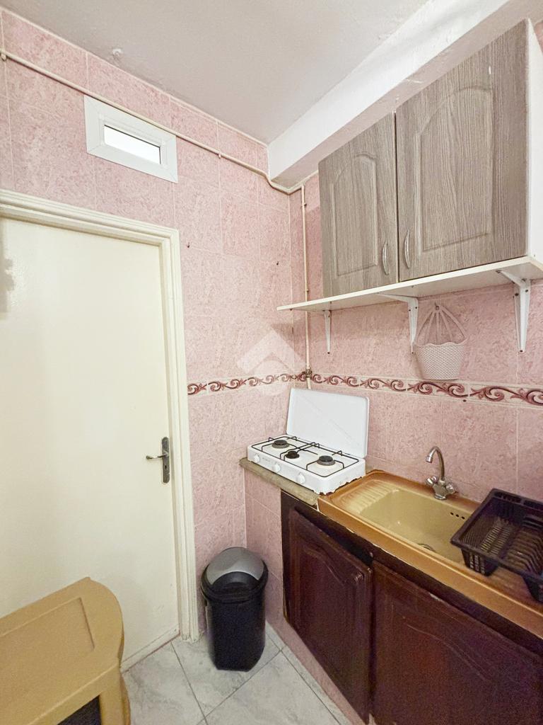 La kitchenette est aménagée par des éléments de rangements et semi-équipée d'un réfrigérateur et d'une plaque de cuisson à gaz.